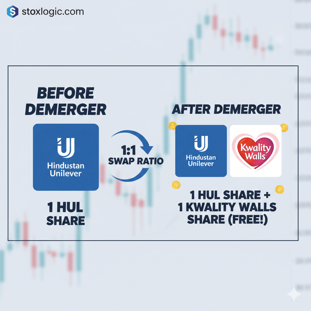 इसका मतलब है कि आपके पास मौजूद HUL के हर 1 शेयर के बदले आपको नई कंपनी (Kwality Walls) का 1 शेयर बिल्कुल मुफ्त मिलेगा। आपके पुराने HUL के शेयर भी आपके पास सुरक्षित रहेंगे।