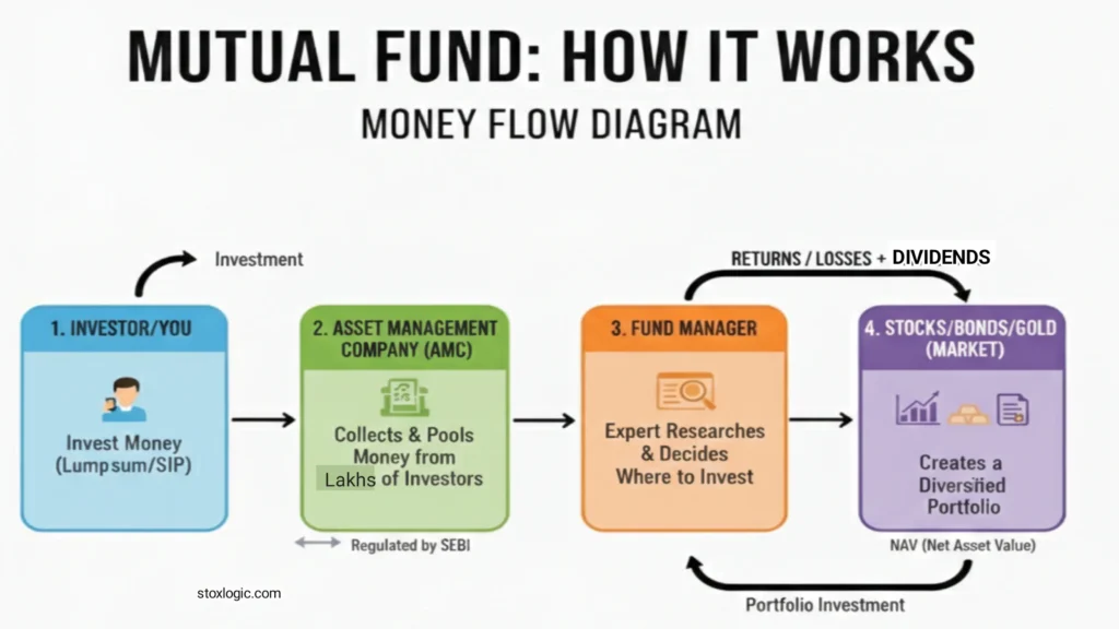 म्यूचुअल फंड भी बिल्कुल ऐसे ही काम करता है। हजारों निवेशक थोड़ा-थोड़ा पैसा एक जगह जमा करते हैं और एक प्रोफेशनल फंड मैनेजर उस पैसे को Reliance और Tata जैसी बड़ी कंपनियों में निवेश करता है।